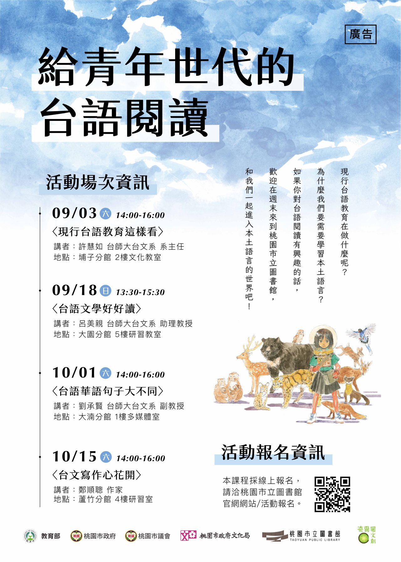 二、自 111 年 9 月開始,本土語文為國、高中必選修科目,而台語(閩南語)又為本土語文必選修多數,且奇異果文創事業有限公司與國立台灣師範大學合作推出奇異果版的高中台語課本,選文內容新穎並涵蓋多個議題,亦兼顧台語的語言和文學這兩面向,因此本館特別邀請奇異果文創事業有限公司策劃一系列講座,從台語教育和學習、賞析、創作來推廣台語本土語文,並可搭配相關讀物一起閱讀。