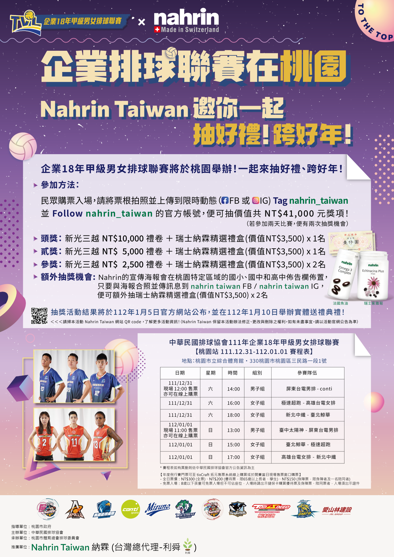 二、 旨揭賽事由中華民國排球協會主辦,本府列名賽事指導單位,訂於 111 年 12 月 31 日至 112 年 1 月 1 日假桃園市立體育館辦理。