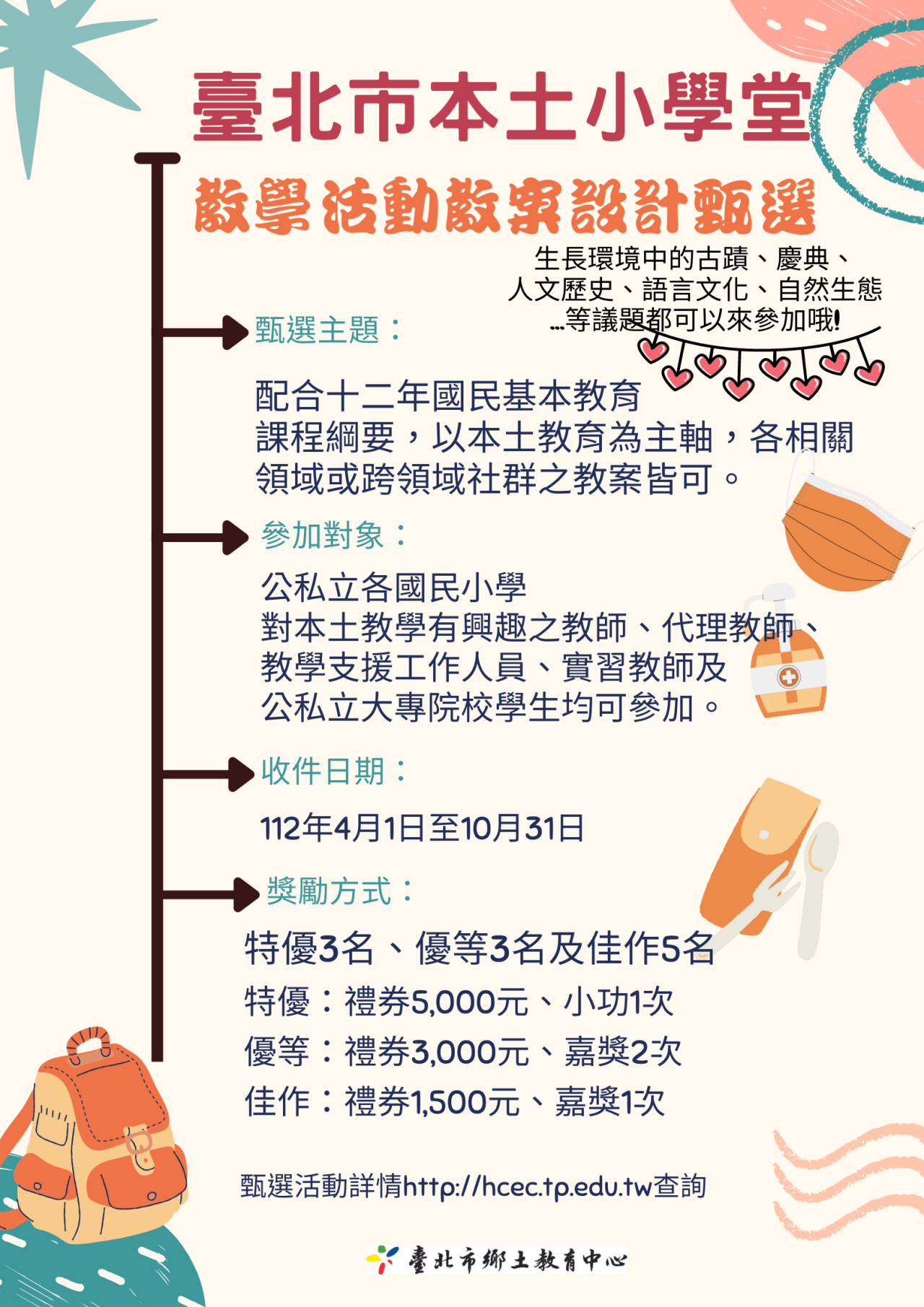 主旨: | 轉知臺北市鄉土教育中心辦理 112 年度「臺北市本土小學堂」教學活動教案甄選一案,請查照。 |